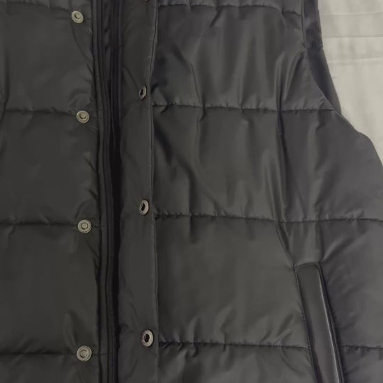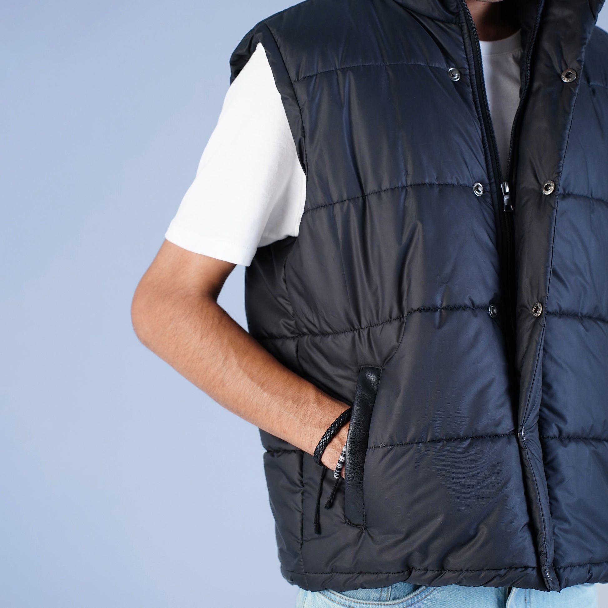 Men's Black Sleeveless Puffer Jacket. Dual closure-zip & buttons. Finished with premium leather placement over pocket. Detailing that elevates it beyond the ordinary. For those who choose craftmanship over compromise!